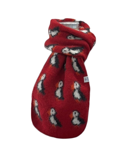 Langer Tischläufer bzw. Wollschal in der Farbkombination Rot. Mit Papageientaucher-Motiv auf einer Seite.