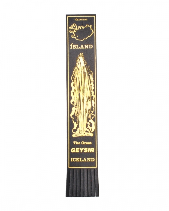 Schwarzes Leder-Lesezeichen mit goldfarbenem Geysir-Motiv.